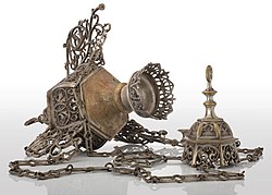| Lampka Ner Tamid (hebr. wieczne światło) została odnaleziona, wraz z innymi przedmiotami, podczas prac archeologicznych, prowadzonych na terenie po Wielkiej Synagodze przy ulicy Berka Joselewicza w 2004 roku.Lampka jest najczęsciej zawieszana nad lub przez aron ha-kodesz (wcześniej w niszy na ścianie zachodniej synagogi) i jest zapalona niezależnie od tego, czy synagoga jest pusta, czy zamknięta. Tradycja ta ma przypominać o stale zapalonej menorze w starożytnej Świątyni Jerozolimskiej. (Tekst: Artur Szyndler, CC BY 4.0) | https://muzea.malopolska.pl/en/objects-list/2063 | RDW MIC | Datei:Lampa Ner Tamid z Wielkiej Synagogi w Oświęcimiu, MŻ 9.jpg | |