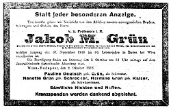 | Todesanzeige für Jakob Grün | Neue Freie Presse 1916-10-03, p. 11 ( http://anno.onb.ac.at/cgi-content/anno?aid=nfp&datum=19161002&seite=11&zoom=33 ) | unknown; perhaps his wife | Datei:Jakob Moritz Grün Todesanzeige NFP 1916-10 02 p11.jpg |