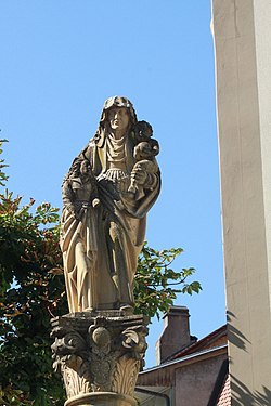Die Figurengruppe stellt die heilige Anna mit ihrer heranwachsenden Tochter Maria (Mutter von Jesus) zu ihrer Rechten dar. Auf dem linken Arm trägt Anna das Jesuskind. Sie verkörperte die mütterlichen Tugenden und veranschaulichte das von der Gegenreformation gepriesene Familienmodell; daher die Zärtlichkeit, die in der Figurengruppe zu spüren ist. | Dateien (Bilder, Videos, Audios) des Medienarchivs Wikimedia Commons unterstehen einer Freien Lizenz . Diese Freiheit bedeutet nicht, dass dadurch das Urheberrecht entfällt. Im Gegenteil: Als Gegenleistung für die kostenlose Nutzung muss der Weiternutzer die Lizenzbedingungen einhalten. Er muss den Fotografen/Autor Martin Thurnherr als Urheber nennen und die Quelle (Wikimedia Commons) angeben - wenn möglich mit Link zur Originaldatei. Dieses Bild wurde von Martin Thurnherr erstellt. Wenn Sie eines meiner Bilder nutzen möchten, bin ich für eine E-Mail (Account nötig) oder eine Nachricht auf meiner Diskussionsseite dankbar. Bitte beachten Sie die Lizenzbedingungen. Auch andere Lizenzierungsmöglichkeiten sind diskutierbar. | Hans Gieng und Werkstatt | Datei:Fontaine de Sainte-Anne FR Hans Gieng 01.jpg | |