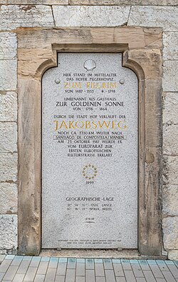 Infotafel mit der Information, dass hierdurch der Jakobsweg verläuft. | Eigenes Werk | PantheraLeo1359531 | Datei:Infotafel Jakobsweg durch Hof 20210821 HOF04162.jpg | |