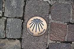 1980 begann der spanische Priester Elías Valiña Sampedro, den Camino Francés in Nordspanien mit gelben Pfeilen zu markieren[10] und für den Aufbau eines Herbergsnetzes zu sorgen, nachdem er zuvor eine Doktorarbeit über die historischen und kirchenrechtlichen Grundlagen des Weges vorgelegt hatte. Neben der Jakobsmuschel dient der Flecha Amarilla als Wegmarkierung auf Schildern, Hauswänden, Steinen und Bäumen, an Zäunen und Mauern und direkt auf den Straßen und Wegen.[11] Zugleich nahmen namhafte wissenschaftliche Kongresse und Ausstellungen (u. a. München 1984, Gent 1985) die europäischen Dimensionen der Pilgerfahrt nach Santiago de Compostela in den Blick. Die wachsende Popularität des Weges war für den Europarat Anlass, sich ebenfalls dem Thema zu widmen. Seine Deklaration von Santiago de Compostela (23. Oktober 1987) erhob die Wege der Jakobspilger in Europa zur ersten europäischen Kulturstraße (Council of Europe Cultural Route). An Behörden, Vereine und Einzelpersonen erging die Aufforderung, „die Pilgerstraßen nach Santiago in ganz Europa zu kennzeichnen und zu identifizieren“. Zwei internationale Kongresse, die der Europarat im Oktober 1988 mit der Deutschen St. Jakobus-Gesellschaft auf Schloss Schney bei Lichtenfels und im September 1989 mit dem Centro Italiano di Studi Compostellani in Viterbo veranstaltete, lieferten verbindliche Grundlagen für eine Ausweisung der Routen. So betonte die Abschlusserklärung des Kongresses auf Schloss Schney „mit Nachdruck die Notwendigkeit einer streng wissenschaftlichen Identifikation der historischen Wege nach Santiago, namentlich diesseits der Pyrenäen, sowie der weiteren Spuren dieses Kultes, die sich auf schriftliche und ikonographische Dokumente wie auf Nachforschungen im Gelände stützt“. Die Erklärung hob hervor, dass dies eine „unabdingbare Voraussetzung für deren Revitalisierung“ sei.