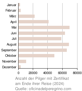 Das offizielle Pilgrim's Reception Office veröffentlicht Statistiken bzgl. jene Pilger, die ihre Reise in Santiago de Compostela beendet haben und ein Zertifikat erhalten haben. Im Jahr 2024 gab es rund 499.000 Pilger, 12 % mehr als im Vorjahr. Die meisten Pilger waren Spanier (44 %), US-Amerikaner (8 %), Italiener (6 %), Deutsche (4,9 %) und Portugiesen (4,6 %). Die beliebtesten Routen waren der Frances (47 %), Portuguese (19 %), Portuguese Costa (15 %), Ingles (5,6 %), Primitivo (4,9 %) und Norte (4,3 %). Die am häufigsten gewählten Startorte waren Sarria (32 %), Tui/Valença (11,3 %), Porto (10,5 %), Saint-Jean-Pied-de-Port (6,9 %) und Ferrol (5,7 %). Rund 93 % haben die Reise zu Fuß unternommen and 4,6 % auf dem Fahrrad. 591 Pilger reisten auf dem Pferd, 272 per Boot und 270 im Rollstuhl. Die Monate, in denen die meisten Pilger in Santiago ihre Reise beendet haben, war zwischen Mai und September.[7]