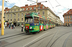 - die Straßenbahnlinien 1, 3, 4, 5, 6 und 7 sowie am Abend und Wochenende die Linie 23 (Jakominiplatz zur Krenngasse)