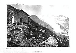 | Jamthal-Hütte aus Zeitschrift des Deutschen und Oesterreichischen Alpenvereins 1894 Band 25 | austrian literature online | Kunsthaus Ludwig Schaller Stuttgart (1860 - 1924) | Datei:Jamthal-Hütte 1894.jpg | |