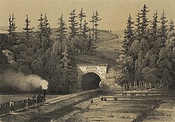 | Tunnel bei Chotzen gegen Olmütz. | FÖRSTER, Ludwig. Beschreibende und malerische Darstellung der K. K. österreichischen Staatseisenbahn von Olmütz bis Prag. Wien: Verlag von L. Försters artist. Anstalt, 1845. | Ludwig Förster (1798-1863), Amédée Demarteau | Datei:Beschreibende Darstellung 20 Tunnel bei Chotzen gegen Olmütz.jpg | |