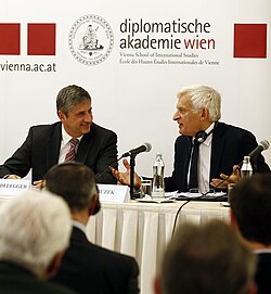 | Außenminister Michael Spindelegger, Bundesminister a.D. Werner Fasslabend und der Präsident des Europäischen Parlaments Jerzy Buzek bei einer Diskussion zum Thema "Wohin geht Europa", Diplomatische Akademie, Wien, 04.12.2012, Foto: Dragan Tatic | Diskussion "Wohin geht Europa?" Uploaded by High Contrast | Österreichische Außenministerium | Datei:Diskussion "Wohin geht Europa?" (8244720564).jpg | |