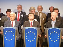 | The three presidents of the European Union - Jerzy Buzek (European Parliament), José Manuel Barroso (European Commission), Herman Van Rompuy (European Council) - during a press conference in the Berlaymont in Brussels on the 30th of November 2011. | Eigenes Werk | Marek Blahuš | Datei:Les trois présidents 2011-11-30.jpg | |