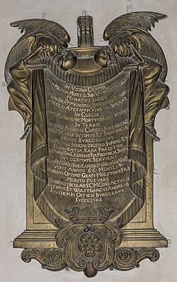Bronze-Epitaph für Johannes Andreas Orsini-Rosenberg mit Wappenrelief der Familie Rosenberg, angebracht an der nordseitigen Innenwand der Pfarrkirche Mariä Himmelfahrt, Marktgemeinde Maria Saal , Bezirk Klagenfurt Land, Kärnten , Österreich , EU | Eigenes Werk | Johann Jaritz | Datei:Maria Saal Dom N-Wand Bronze-Epitaph Johannes Andreas Orsini-Rosenberg 30092016 4672.jpg |