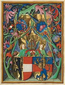 | Wappen des Erzbistums Salzburgs und des Bischofs Johann Beckenschlager | Missale quinque tomis constans, qui omnes multis (plus centum) et nitidissimis picturis ornati sunt (Bd. 1) - BSB Clm 15708, S.l., 15. Jh. http://nbn-resolving.de/urn/resolver.pl?urn=urn:nbn:de:bvb:12-bsb00045164-7 | Berthold Furtmeyr | Datei:BSB Clm 15708 Wappen Beckenschlager 1.jpg | |