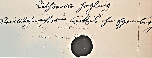 | Vertrag des Steinmetzmeisters Johann Gallus Hügel mit dem Stift Herzogenburg, nach seinem Tod führt die Witwe Catharina Höglin den Auftrag als Steinmetzmeisterin weiter, in den Mitt. des MuKV Kaisersteinbruch Nr. 42, 1996 veröffentlicht, davon Foto Quelle Stift Herzogenburg Urheber Steinmetzmeisterin Catharina Höglin mit eigenhändiger Unterschrift und Siegel, 1720 | Datei:Steinmetzmeisterin.jpg | |||
