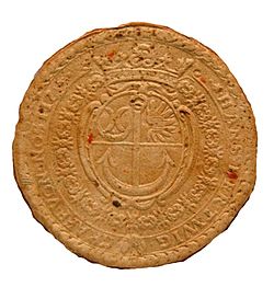 1651: Quadrierter Schild mit gekröntem roten Herzschild, darin drei goldene Balken (Grafschaft Rieneck). Im ersten Feld in Blau auf goldnem Halbmond zwei auswärtsgekrümmte, rot und silbern geschachtete Hörner mit den Spitzen nach unten. Im zweiten Feld in Silber ein schwarzer Adlerflügel belegt mit einem goldenen Balken. Auf der Schildesteilung liegt ein Anker, der unten im dritten silbernen Felde blau, im vierten, blauen aber golden ist. Eine Grafenkrone bedeckt den Schild, darauf ruhen drei gekrönte Helme. Auf dem rechten mit schwarz-silbernen Decken der mit dem Balken belegte Adlerflügel, auf dem mittleren mit rechts schwarz-silbernen, links rot-silbernen Decken ein flugbereiter silberner Schwan (Rieneck), auf dem linken mit rot-silbernen Decken zwei von Silber und Rot geschachtete Büffelhörner, dazwischen drei Straußenfedern blau, golden und blau.[5]