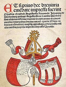 | Wappen des Bischofs Johann von Werdenberg, in der Widmung des Augsburger Breviers, 1485 | Augsburger Brevier, 1485: https://www.deutsche-digitale-bibliothek.de/item/EWGOKLD44AQ76LTEHUYJUMKG35GXMKCG | Erhard Ratdolt († 1528) | Datei:Werdenberg Wappen 1485.jpg |