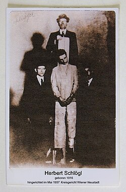 | Abbildung von Herbert Schlögl (* 1916) nach seiner Hinrichtung am 12. Mai 1937 im Kreisgericht Wiener Neustadt, ursprünglich als File:Plakat Schlögl.jpg hochgeladen von AktionFreieKunst.com . Hinter dem Würgegalgen steht Scharfrichter Johann Lang. Schlögl war zusammen mit dem ebenfalls von Scharfrichter Johann Lang am 12. Mai 1937 im Kreisgericht Wiener Neustadt hingericheten Fritz Fleck (* 1917) wegen des Raubmordes an Ingrid Wiengreen (1909–1937) zum Tode verurteilt worden. | Eigenes Werk | Cyan22 | Datei:Plakat Herbert Schlögl.jpg |