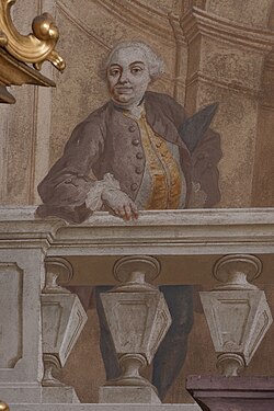 | Na fotografii je portrét malíře Jana Lukáše Krackera, který se nachází na fresce v kostele sv. Petra a Pavla v Nové Říši. | Vojtěch Krajíček. Autorem díla je malířská dílna Jana Lukáše Krackera. 2009-02-28 | Johann Lucas Kracker | Datei:Portret jana lukase krackera.jpg |