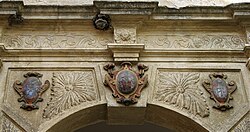 | Wappen des Hans Ludwig von Kuefstein (1582-1656) (mittig) und die seiner beiden Ehefrauen Maria Grabner von Rosenburg (1589–1623) (vom Betrachter aus links) und Susanna Eleonora von Stubenberg (1602–1658) (rechts) | Eigenes Werk | Matthias Laurenz Gräff | Datei:Schloss Buchberg. Wappen Grabner, Kuefstein und Stubenberg.jpg | |