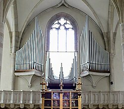 II/P | 31 | pneumatische Kegellade, nicht erhalten, seit 1983 Orgel von Orgelbau M. Walcker-Mayer[6] im historischen Gehäuse |