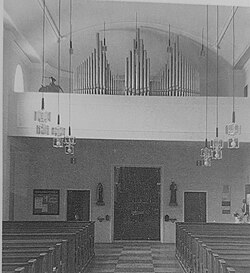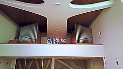 | Blick vom Altar zum Kauffmann-Orgel | Pfarre Canisius | Datei:Blick vom Altar zur Kaufmann-Orgel.jpg | ||