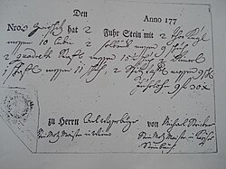 Beleg einer Steinlieferung von 1772 von Kaisersteinbruch nach Wien | Wiener Stadt- und Landesarchiv , Steinmetzakten | Steinmetzmeister Strickner | Datei:Fuhrlohn 1772.JPG | |