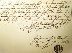 Vertrag: Baumeister Johann Ferdinand Mödlhammer und Steinmetzmeister Johann Michael Strickner. Stiege im Schloss Esterházy in Eisenstadt | Esterházy-Archiv Burg Forchtenstein | Fürstlicher Schreiber mit beider persönlicher Unterschrift | Datei:Mödlhammer1.JPG | |