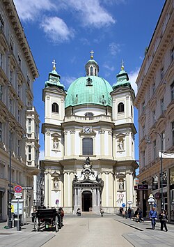 Hauptfassade bzw. Südwestansicht der Peterskirche im 1. Wiener Gemeindebezirk Innere Stadt . Der erste Kuppelbau des barocken Wien wurde ab 1701/02 errichtet. Die Planung und der Baubeginn (Fundamente) erfolgte unter Gabriele Montani . Nachdem dieser als Festungsarchitekt nach Madrid zog, setzte ab 1703 sehr wahrscheinlich Johann Lucas von Hildebrandt den Bau nach veränderten Plänen fort. | Eigenes Werk | C.Stadler/Bwag | Datei:Wien - Peterskirche (3).JPG |