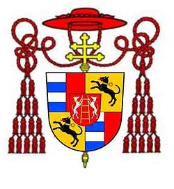 Gevierter Schild, 1 und 4 gespalten von Silber und Rot, vorne zwei blaue Balken, 2 und 3 in goldenem Feld ein springender schwarzer Bracke. Im Mittelschild in rotem Feld eine Leiter mit 2 Bracken im Stachelhalsband. Als Helmzier den roten Pontifikalhut (Galero) des Kardinals mit je 15 Quasten (fiocchi).