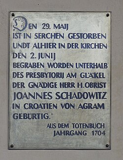 - ↑ Totenbuch der Katholischen Pfarrkirche Wittichenau. 1704 („Serchen Den 29. Maij ist in Serchen gestorben und alhier in der Kirchen den 2. Junij begraben worden unterhalt des Presbytonj am Gläkel der Gnädige Herr H. Obrist Joannes Schadowitz in Croatien von Agram gebürtig. Dem eine teusche Predigt gehalten. aet 80. an.“).