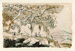 Goethe lernte in Italien die Bau- und Kunstwerke der Antike und der Renaissance kennen und bewundern; seine besondere Verehrung galt Raffael und dem Architekten Andrea Palladio. An dessen Bauten hatte er in Vicenza mit Begeisterung wahrgenommen, dass sie die Formen der Antike zu neuem Leben erweckten.[89] Unter Anleitung seiner Künstlerfreunde übte er sich mit großem Ehrgeiz im Zeichnen; etwa 850 Zeichnungen Goethes sind aus der italienischen Zeit erhalten. Er erkannte aber auch, dass er nicht zum bildenden Künstler, sondern zum Dichter geboren sei. Intensiv beschäftigte er sich mit der Fertigstellung literarischer Arbeiten: Er brachte die bereits in Prosa vorliegende Iphigenie in Versform, vollendete den zwölf Jahre zuvor begonnenen Egmont und schrieb weiter am Tasso. Daneben beschäftigte er sich mit botanischen Studien. Vor allem aber „lebte“ er: „Im Schutze des Inkognitos (den deutschen Freunden war seine wahre Identität jedoch bekannt) konnte er sich in einfachen Gesellschaftsschichten bewegen, seiner Freude an Spielen und Späßen freien Lauf lassen und erotische Erfahrungen machen.“[90][91]