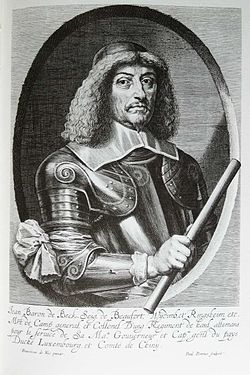 | Freiherr Johann von Beck. Kupferstich, 22,5 x 15,4 cm. Inscription: Jean Baron de Beck. Seigr. de Beaufort, Wÿdimb, et Ringsheim etc. / Mre de Camp general, et Collonel D'ung Regiment de haut allemans / pour le seruice de Sa Mate. Gouuerneur et Capne. genl du pays / Duché Luxembourg et Comté de Chinÿ. | http://lb.wikipedia.org/wiki/Bild:JeandeBeck.JPG | Franciscus de Nÿs pinxit - Paul Pontius sculpsit. | Datei:Johann von beck.jpg |