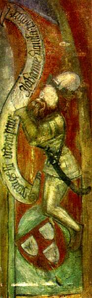 | The self-portrait of the painter Johannes Aquila in Martjanci, northeastern Slovenia. It is located on the southern wall of the presbyterium in St. Martin's Church in Martjanci and dates to 1392. It is the oldest self-portrait in Slovenia and along with Aquila's self-portrait in Velemér, western Hungary, among the oldest in Europe. The Latin inscription reads "Omnes s(anct)i. orate. p(rom)e Johanne Aquile pictore", which means: "All the saints, pray for me, Johannes Aquila John the Ev., the painter." The coat of arms is the personal coat of arms of the painter and has the letter A inscribed on it. | Aquila János önarcképe - Mártonhely, 1392. A magyarok krónikája. Szerkesztette: Glatz Ferenc. Officina Nova, Budapest | János Aquila | Datei:Aquila Johannes - Self-portrait (1392).jpg | |