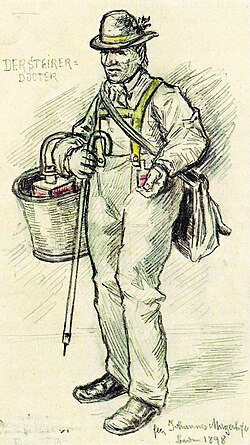 | Der Steirer Docter alias „Amasdocter“, Zeichnung von Johannes Mayerhofer | Johannes Mayerhofer: Die Amastrager. In: Illustriertes Wiener Extrablatt , Ausgabe vom 23. Oktober 1898, Nr. 292 | Johannes Mayerhofer | Datei:Steirer Docter.jpg |
