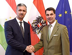| Johannes Peterlik, Secretary General for Foreign Affairs (Austria) meets the Deputy Minister of Foreign Affairs of Tajikistan (Vienna, 18 July 2018). | Generalsekretär Peterlik trifft Vize-Außenminister von Tadschikistan Nasreddin | Bundesministerium für Europa, Integration und Äußeres | Datei:Johannes Peterlik Ismatullo Nasreddin July 2018 (41680533280).jpg |