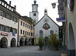 Im Jahre 1218 forderte Papst Honorius III. vom Graf Hugo von Montfort eine Mitbeteiligung am Kreuzzug. Der Graf übergab dem Johanniterorden ein Hospiz in der Marktgasse 1. Es wurde in romanischen Stil eine Kirche gebaut, die im Laufe der Zeit erweitert wurde. Seit 1510 befindet sich im Turm eine Ritterfigur, die „Bläsi“ genannt wird und mit Hammerschlägen auf eine Glocke die Zeit angibt.[2]
