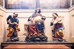 Unter dem erhöhten Altarpodest befindet sich mit einem mittigen Abgang die Krypta. Sie ist durch eingelegte Kieselsteine und grob behauene Quader als Grotte ausgestaltet und besitzt verschiedene Stuckaturen mit Todessymbolen. Das Altarraumgitter der Krypta stammt aus dem Anfang des 18. Jahrhunderts. Auf dem dortigen Altar befindet sich eine Schnitzgruppe mit einer Pietà, flankiert vom Heiligen Simon Petrus und der heiligen Maria Magdalena. Das ursprüngliche Leinwandbild aus dem 18. Jahrhundert zeigt in einer Kopie nach Paul Troger Christus am Ölberg.