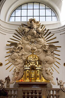Der Hauptaltar in einer flachbogigen Altarnische steht erhöht auf einer ovalen Terrasse mit seitlichen Treppen. Über dem Altar befinden sich stuckierte Putten und Engel mit Gottvater und der Heilig-Geist-Taube als oberem Abschluss. Der Altartisch selbst wurde von Heinz Tesar gestaltet. Der Tabernakelaufsatz zeigt eine kleine Kreuzigungsgruppe und Engelfiguren mit den Leidenwerkzeugen Christi. Das Kircheninnere wurde in den Jahren 2020 bis 2023 renoviert, wobei auch ein neuer Volksaltar eingerichtet wurde.
