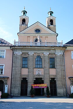 Der Saalbau der Kirche mit seiner zweigeschoßigen Vorhalle besitzt eine nach Süden ausgerichteter Fassade. Die Kirchenfassade ist durch enggestellte Riesenpilaster gegliedert. Drei hohe Rechtecktore mit darüber befindlichen drei Fenstern bilden die Fassade des Kirchenvorraumes. Die Tore sind oben mit Schmiedeeisengittern abgeschlossen. Sie wurden um 1704 geschaffen, das mittige trägt wie die Kirchenfassade das Wappen des Stifters Johann Ernst von Thun. An diese Fassade schließen seitlich bündig die niedrigeren Spitalseingänge an.