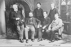 | Böhmische Komponisten. Sitzend, von links nach rechts: Antonín Dvořák , Heinrich von Kaan , Zdeněk Fibich . Stehend, von links nach rechts: Karel Bendl , Josef Bohuslav Foerster , Karel Kovařovic . | Österreichische Nationalbibliothek , Objektnummer #8024848 - NB 534278-B | unbekannter Fotograf | Datei:WP Böhmische Komponisten.jpg |