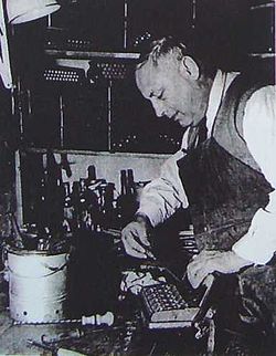 | Mr. Josef Fleiß in his Work shop (* 1906; † Juli 1978) Accordion builder | Original erhalten von Frau Ulzer Enkelin des Abgebildeten | Johann Pascher | Datei:Josef-fleiss.jpg |