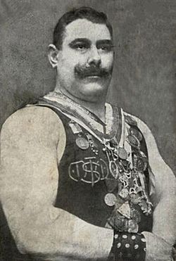 - 1910, 1. Platz, WM in Düsseldorf, 4-Kampf, S, mit 460 kg, vor Heinrich Rondi, Deutschland und Berthold Tandler;