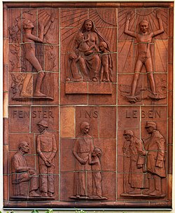 | Diese Datei zeigt den Wiener Gemeindebau mit der ID 891 . | Eigenes Werk | Thomas Ledl | Datei:Steinzeugrelief Fenster ins Leben, Schwenkgasse 54-60.jpg |