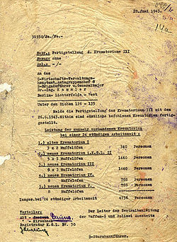 | Meldung der Fertigstellung der Krematorien II, III, IV, V in Auschwitz-Birkenau und Angabe der Leistungsfähigkeit bei 24 Stunden Betrieb | Auschwitz concentration camp, Państwowe Muzeum Auschwitz-Birkenau w Oświęcimiu | Zentralbauleitung Auschwitz, Töpf & Söhne | Datei:Leisung der Krematorien in 24 Stunden lt. Zenrralbauleitung der Waffen-SS.jpg |