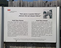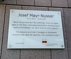 | Memory plaque for the antifascist Josef Mayr-Nusser in Bozen-Bolzano (Bozner Boden) | Eigenes Werk | Bartleby08 | Datei:Mayr Nusser Bozner Boden 2021.jpg |