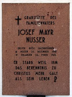 Josef Mayr-Nusser[1] (* 27. Dezember 1910 in Bozen; † 24. Februar 1945 bei Erlangen) war ein katholischer Laie, der nach seiner Weigerung, den sogenannten Führereid zu leisten, dem Nationalsozialismus zum Opfer fiel.