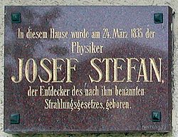 | Gedenktafel für Josef Stefan am Geburtshaus in der Ebentalerstraße 88 in Klagenfurt | Selbst fotografiert | Der ursprünglich hochladende Benutzer war Dreinagel in der Wikipedia auf Deutsch | Datei:Stefan haus.jpg |