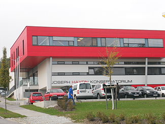 | Südansicht des Joseph-Haydn-Konservatoriums in der burgenländischen Hauptstadt Eisenstadt . Nach Beschluss der burgenländischen Regierung 1961 eine Landesmusikschule zu errichten, erfolgte 1966 der Spatenstich. Am 15. Oktober 1970 fand die Inbetriebnahme des Baues, der nach Plänen der Architekten Gottfried Fickl und Matthias Szauer errichtet wurde und rd. 15 Mio. Schilling kostete, statt. 1971 erfolgte die Umbenennung in Joseph-Haydn-Konservatorium des Landes Burgenland . Ab 2007 wurde das Gebäude unter der Regie des Architektenbüros Rudischer & Panzenböck generalsaniert, durch Zubauten erweitert und mit einem Festakt am 9. April 2008 abgeschlossen. Im Herbst 2021 wurde die Akkreditierung zur Privathochschule für Musik nach einjähriger Vorbereitung eingereichtː 1 . Mit 2023/24 began das erste Semester als Privathochschule, dazu wurde vorher der Gebäudekomplex noch umgebaut bzw. erweitertː 2 . | Eigenes Werk | C.Stadler/Bwag | Datei:Eisenstadt - Joseph-Haydn-Konservatorium.JPG |