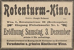 | Eröffnungsinserat. Wiener Rotenturmkino, Geschäftsführer Joseph Delmont . Aus: Illustrirtes Wiener Extrablatt, 27. November 1910, 31. | Illustrirtes Wiener Extrablatt, 27. November 1910, 31. | Illustrirtes Wiener Extrablatt | Datei:1910-11-27, Illustrirtes Wiener Extrablatt, 1910-11-27, 31. Inserat. Rotenturmkino, Joseph Delmont.jpg |
