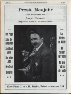 | Joseph Delmont - 1913 New Year Wishing | http://anno.onb.ac.at/cgi-content/anno?aid=nwg&datum=19101127&query=%22joseph+delmont%22&ref=anno-search&seite=85 Neues Wiener Tagblatt 27.10.1910, page 85 | Anonym Unknown author | Datei:Joseph Delmont 1912.png | |