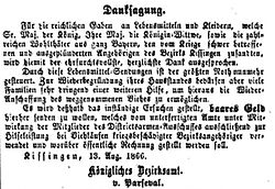 Am 13. August 1866 dankte Parseval mittels Zeitungsanzeigen für die vielen Lebensmittel- und Kleiderspenden, die nach Kriegsende ins ausgeplünderte und vom Krieg gebeutelte Bad Kissingen geschickt worden waren. Jetzt bat er allerdings ausdrücklich um Geldspenden für die Wiederbeschaffung von Vieh.[15]