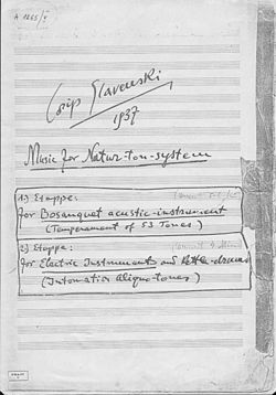 | Josip Slavencki. Title with 53EDO movement. Manuscript | The Faculty of Music in Belgrade Serbia | The Faculty of Music in Belgrade Serbia | Datei:J Slavenski Title with 53EDO.jpg | |