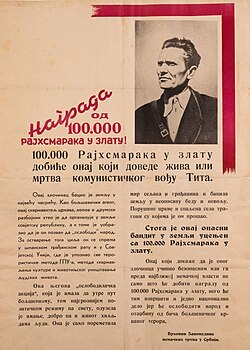 - ↑ Politika, 26. Juni 1950. Zitiert bei Arnold Suppan: Hitler – Beneš – Tito: Konflikt, Krieg und Völkermord in Ostmittel- und Südosteuropa. Hrsg.: Michael Gehler, Wolfgang Mueller (= Internationale Geschichte. Band 1). Verlag der Österreichischen Akademie der Wissenschaften, 2014, ISBN 978-3-7001-7309-0, 9. Rache, Vergeltung, Strafe (In Jugoslawien), S. 1357 (austriaca.at [PDF]).