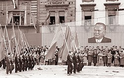 Titos Regime zeichnete sich durch einen starken Personenkult aus, der sich zunächst am Stalinismus orientierte.[30] Tito wurde in staatlich kontrollierten Ritualen als Held eines nationalen Mythos gefeiert und verehrt.